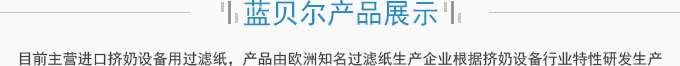 濟(jì)南藍(lán)貝爾工貿(mào)有限公司主要產(chǎn)品擠奶設(shè)備過濾紙,牛奶過濾紙,擠奶機(jī)過濾袋,目前主營進(jìn)口擠奶設(shè)備用過濾紙,產(chǎn)品由歐洲知名過濾紙生產(chǎn)企業(yè)根據(jù)擠奶設(shè)備行業(yè)特性研發(fā)生產(chǎn),產(chǎn)品符合歐盟食品接觸標(biāo)準(zhǔn)及FDA食品接觸標(biāo)準(zhǔn),產(chǎn)品在擠奶設(shè)備過濾紙行業(yè)占有70%以上的份額。并通過了SGS標(biāo)準(zhǔn)技術(shù)檢測中心按國標(biāo)食品級標(biāo)準(zhǔn)進(jìn)行的檢測。產(chǎn)品適用于各種擠奶設(shè)備品牌,本公司目前獲得該區(qū)域產(chǎn)品營銷資格。產(chǎn)品已用于國內(nèi)各大乳企所屬牧...